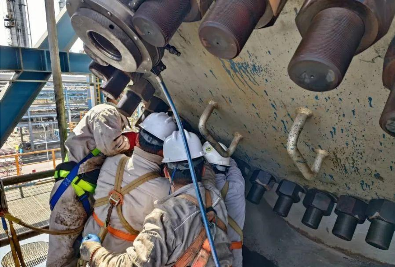 首先在拉伸預緊前應該檢查螺栓和螺母表面是否有銹蝕或者顆粒雜質(zhì)粘附,清除雜物、清洗螺栓銹蝕并潤滑。檢查葉輪和軸承孔的匹配性。接下來安裝螺栓拉伸器。將螺栓拉伸器放置在螺栓上并旋轉(zhuǎn)到正確的位置,確保每個螺栓拉伸器都正確安裝。確保安裝好之后就可以根據(jù)所需拉力調(diào)節(jié)超高壓泵站壓力,升壓拉伸螺栓了。