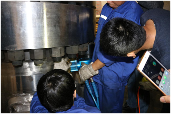 現(xiàn)場工作人員非常認(rèn)真地與波霆機械工程師進(jìn)行交流、探討以及學(xué)習(xí)液壓扳手的正確操作方法。培訓(xùn)剛剛結(jié)束大家就開始忙碌起來,對應(yīng)兩個法蘭現(xiàn)場工人分成兩組,每組三個人,采用兩同步拆卸螺栓。