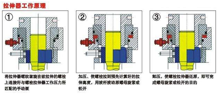 液壓螺栓拉伸器一般由液壓泵、高壓軟管、壓力表和拉伸體組成。其中液壓泵為動力源,壓力表反映泵的輸出壓力,高壓軟管聯(lián)接液壓泵和拉伸體。拉伸體是實現(xiàn)螺栓拉伸的執(zhí)行元件。主要由活塞缸、活塞、支承橋和拉伸螺母組成。結構如下圖所示。工作時,動力源輸出的高壓油經(jīng)高壓軟管輸送至活塞缸3,在壓力作用下活塞缸中的活塞上移,帶動拉伸螺母向上移動。拉伸螺母與工作螺栓螺紋聯(lián)接,從而拉長工作螺栓,使螺栓伸長達到所要求的變形量,變形控制在彈性變形范圍之內(nèi),然后進行預緊或拆卸作業(yè),最后通過液力或者機械回位的方式使工作螺栓回復原來的形狀,完成作業(yè)。