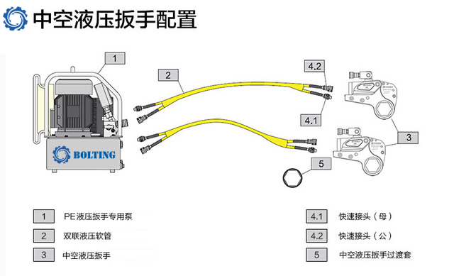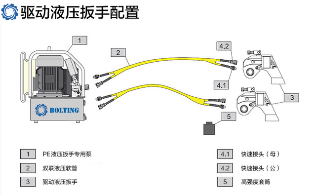 液壓扳手專用泵是液壓扳手的動(dòng)力單元.。液壓扳手專用泵屬于高壓泵,最高工作壓力一般為70MPa,常見的有電動(dòng)液壓泵和氣動(dòng)液壓泵。如下液壓扳手配置圖: